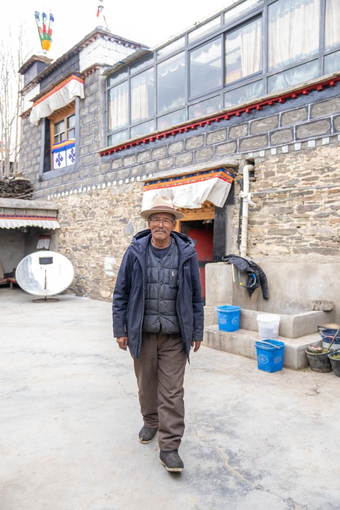 次旦說,平時(shí)二女兒央金在家照顧他的生活,女婿外出務(wù)工。次旦老人生活閑適,村里一有文藝演出,他就過去觀看。