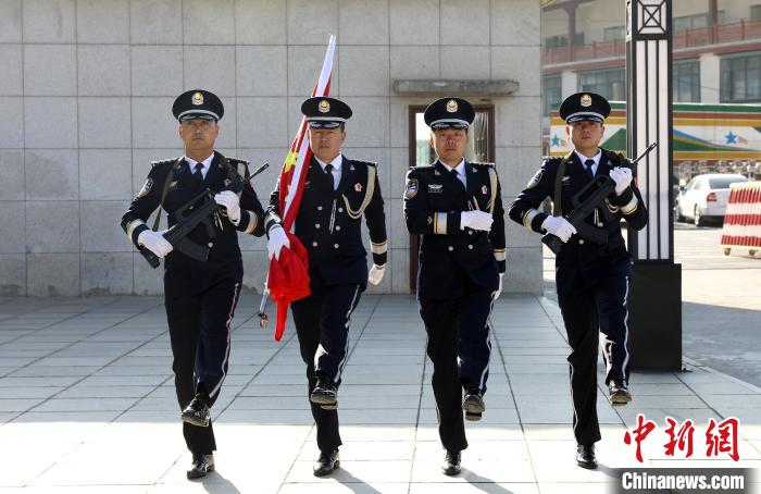 圖為吉隆出入境邊防檢查站移民管理警察將鮮艷的五星紅旗護(hù)送至升旗臺。肖富貴 攝