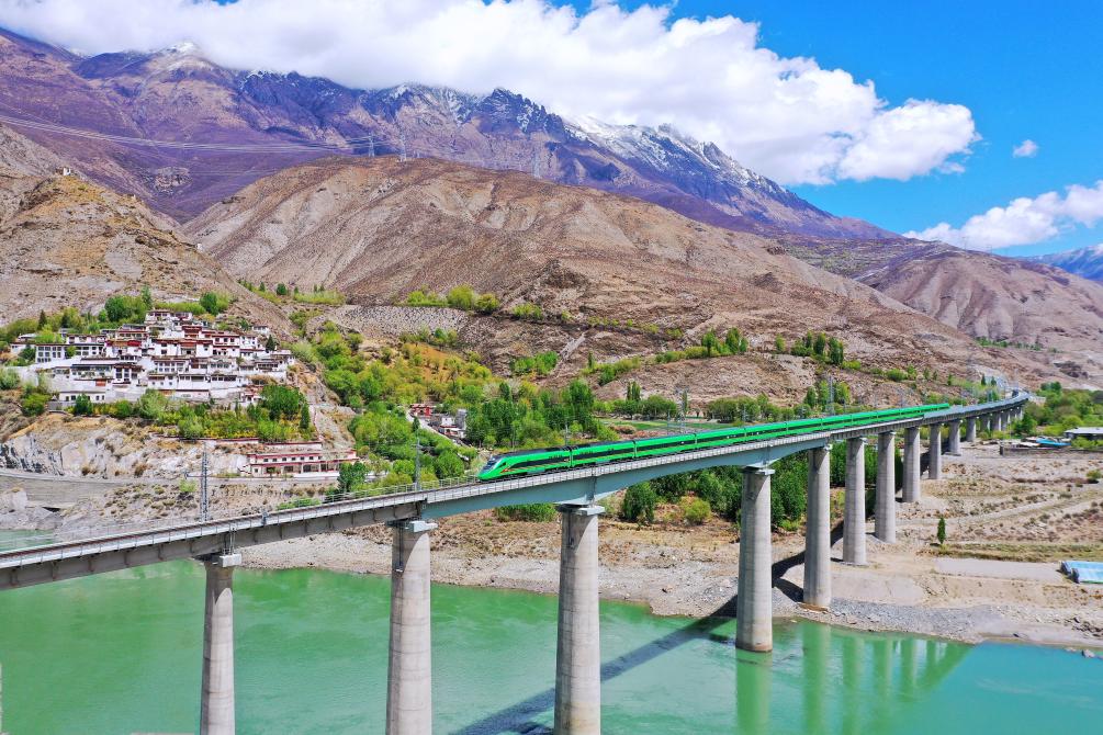 “復(fù)興號(hào)”列車奔馳在雪域高原(2022年4月14日攝)。新華社記者 覺果 攝