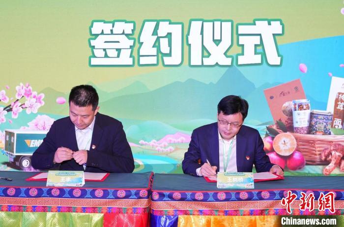 圖為中國(guó)郵政集團(tuán)有限公司西藏自治區(qū)分公司黨委書(shū)記、總經(jīng)理王樹(shù)橋(圖右)與西藏供銷集團(tuán)董事長(zhǎng)王豐簽約。中國(guó)郵政集團(tuán)有限公司林芝市分公司供圖。