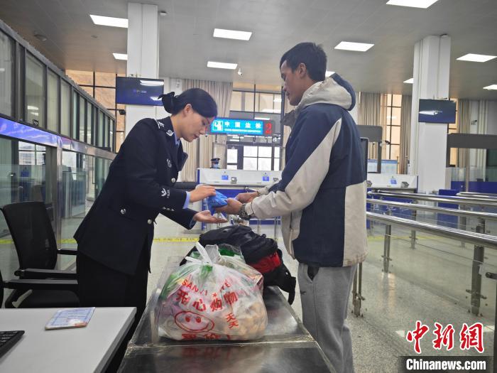 圖為文燕檢查旅客行李物品。肖富貴 攝