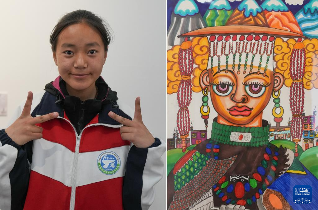 4月19日拍攝的拉薩市特殊教育學校14歲的聽障學生貢覺央吉和她的作品《阿里服飾》(拼版照片)。新華社記者 晉美多吉 攝