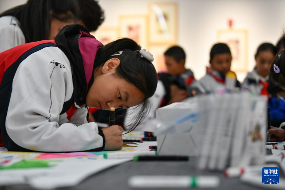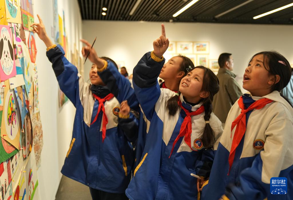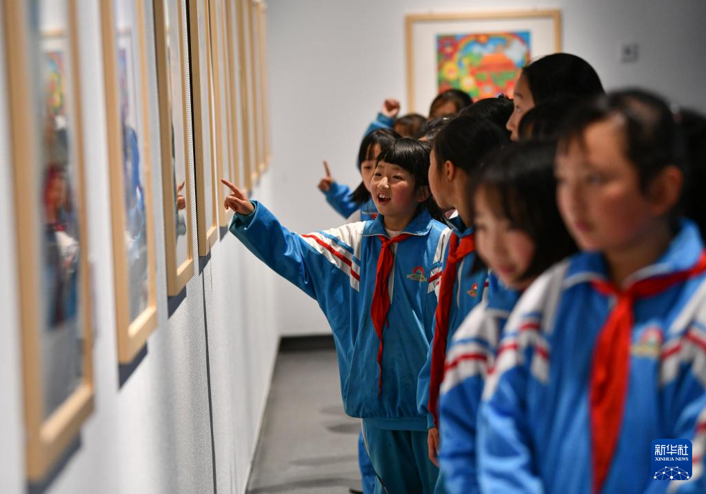 4月19日,拉薩市的小學生在參觀畫展。新華社記者 晉美多吉 攝