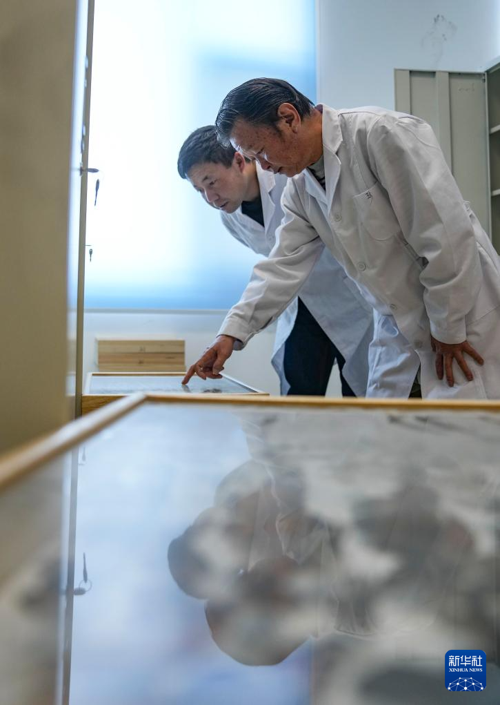 在位于拉薩的西藏自治區(qū)高原生物研究所,達娃(右)和同事查看采集到的昆蟲標(biāo)本(4月22日攝)。新華社記者 晉美多吉 攝