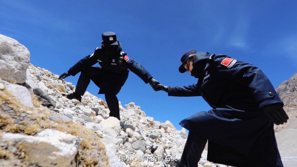 一路上,巡邏隊經(jīng)過了冰塔林、冰川,穿越了碎石灘,“踏上路程的時候是有點緊張和忐忑的,因為感覺其實這路很爛,全是亂石堆,就很害怕自己沒辦法堅持下來,因為從來沒有到過海拔這么高的地方”,新警彭莉緊張地說道。