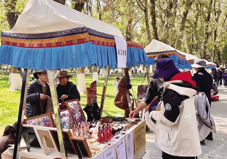 除了文博大講堂和藏戲表演,當日羅布林卡還有文創(chuàng)集市。集市集中了10余類、500余種風格獨特、類型豐富以及具有藝術(shù)性和實用性的創(chuàng)意產(chǎn)品,也是很受大家歡迎?!斑@次趁著‘五一’假期來拉薩旅游,剛好碰到這場‘文化盛宴’,我覺得很幸運,這種機會很難得。我從集市買了很多文創(chuàng)產(chǎn)品,準備送給家人朋友,以后有機會還要過來?!眳桥空f。
