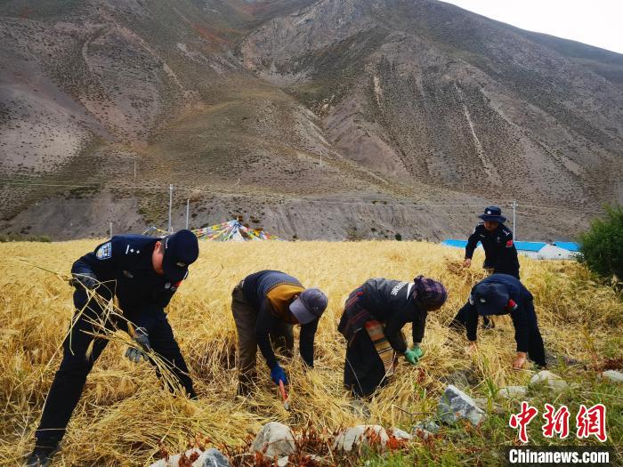 圖為貢當(dāng)邊境派出所民警幫助當(dāng)?shù)剞r(nóng)民秋收。日喀則邊境管理支隊(duì)供圖