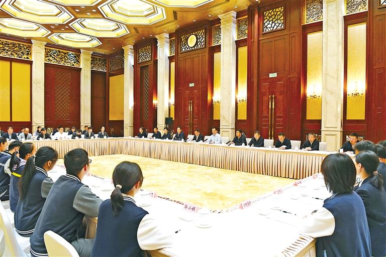 5月10日至11日,西藏自治區(qū)黨政代表團(tuán)赴上海學(xué)習(xí)考察。這是王君正看望西藏班師生、西藏籍高校畢業(yè)生就業(yè)代表,聽取他們?cè)谏虾W(xué)習(xí)、工作情況。 記者 李洲 攝
