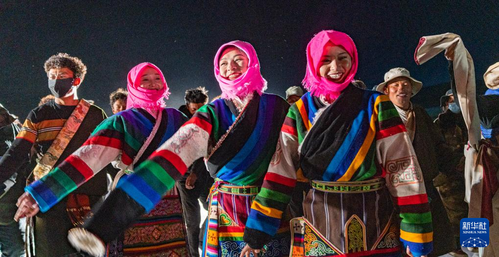 當(dāng)?shù)厝罕娫诩{木錯(cuò)開湖篝火晚會(huì)現(xiàn)場跳鍋莊(5月18日攝)。新華社記者 丁增尼達(dá) 攝