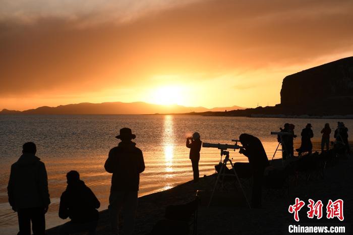 圖為游客在納木錯湖畔觀賞晚霞。貢嘎來松攝