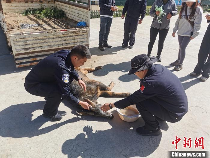 現(xiàn)場檢查發(fā)現(xiàn),“四不像”后腿受傷、身體虛弱,無法自行離開,巡邏民警隨即疏導(dǎo)交通,組織警力將其帶回派出所處理傷口、投喂水食,并及時(shí)移交米林市林草局進(jìn)一步救治。