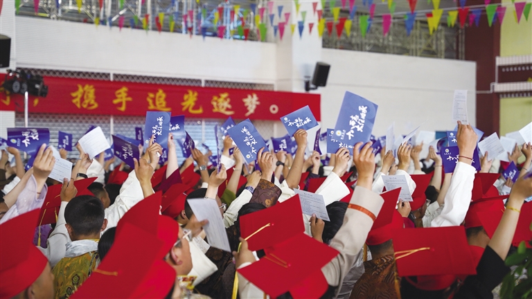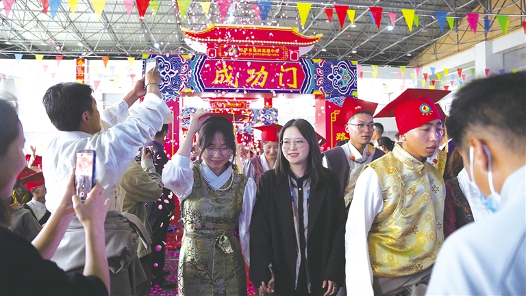 活動(dòng)現(xiàn)場(chǎng),每一位即將畢業(yè)的學(xué)生都要穿過象征著“成人、成才、成功”的三道門。家長代表手捧鮮花,不停地叮囑著孩子;老師們眼眶濕潤,看著即將離校的學(xué)生,充滿了不舍和期待。此刻,千言萬語涌入心間,匯成美好的期盼。