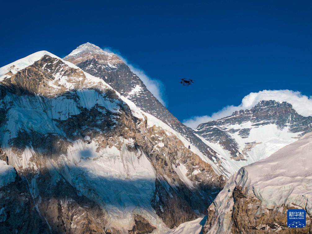 4月30日,大疆運(yùn)載無人機(jī)在珠穆朗瑪峰尼泊爾一側(cè)進(jìn)行物資運(yùn)輸測(cè)試(視頻截圖)。新華社發(fā)