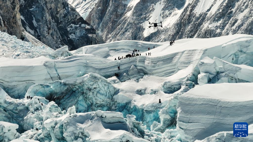 4月30日,大疆運(yùn)載無人機(jī)在珠穆朗瑪峰南坡昆布冰川進(jìn)行物資運(yùn)輸測(cè)試(視頻截圖)。新華社發(fā)