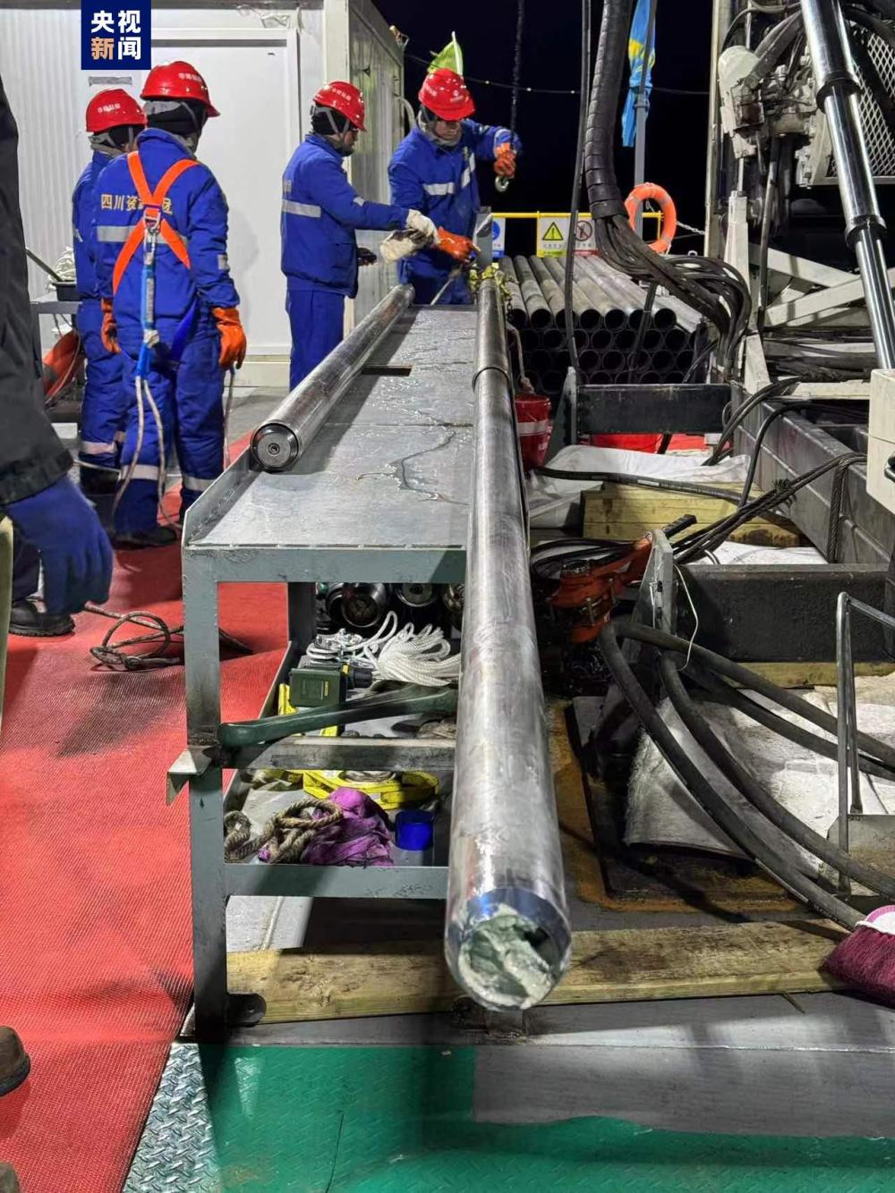 6月6日作為鉆芯的第一天,經(jīng)過(guò)不斷地調(diào)整和試驗(yàn),當(dāng)晚23時(shí)20分,第一次正式鉆探開(kāi)始,鉆頭深入到了水下95米左右的位置,在第一個(gè)點(diǎn)位開(kāi)始鉆取湖泊巖芯。23時(shí)40分,科考團(tuán)隊(duì)獲得了第一批湖泊巖心樣本。科研團(tuán)隊(duì)每次鉆取3米一段,通過(guò)24小時(shí)輪班不間斷作業(yè),截至7日早6時(shí),已獲得9米長(zhǎng)的巖芯。