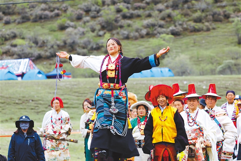 開(kāi)幕式在藏雄村幼兒園小朋友表演的舞蹈《第一支花》中拉開(kāi)序幕,唐古鄉(xiāng)、阿朗鄉(xiāng)、旁多鄉(xiāng)對(duì)北部三鄉(xiāng)獨(dú)特的文化藝術(shù)、生態(tài)環(huán)境以及豐富的“非遺”文化進(jìn)行展示與推介,還有特色服飾展演,他們將秀場(chǎng)搬到大自然,以“傳統(tǒng)民族服飾走秀+‘非遺’文化展示+牧區(qū)生活用具展示”為核心,配以林周縣唐古鄉(xiāng)關(guān)于北部三鄉(xiāng)服飾的唱頌詞與鼓點(diǎn)相融合,為展演提供了獨(dú)特的音樂(lè)伴奏,展現(xiàn)了林周縣北部三鄉(xiāng)豐富的民族文化。