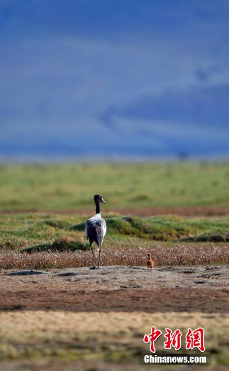 圖為黑頸鶴幼崽在父母的引導(dǎo)下在濕地里棲息、覓食。貢嘎來松 攝