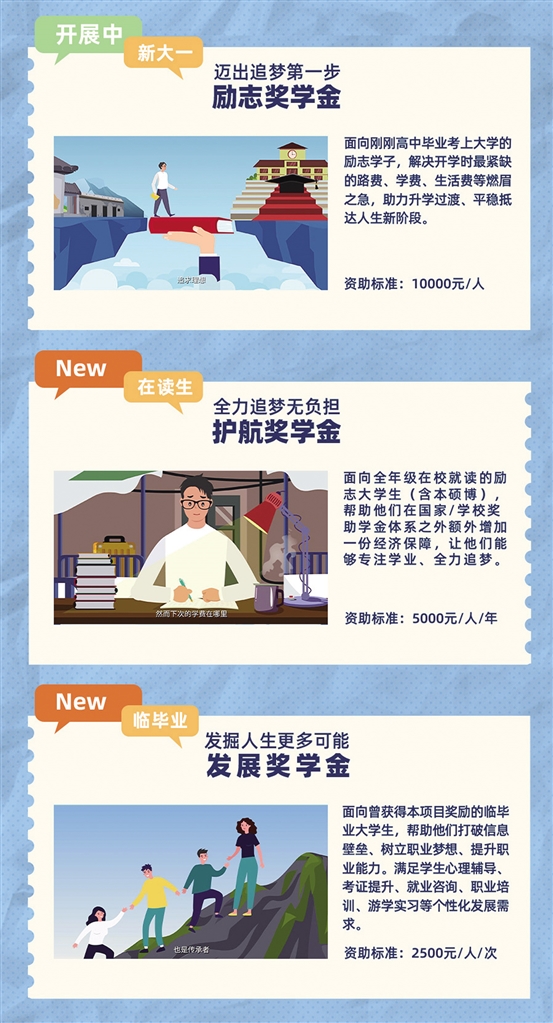 今年高考分?jǐn)?shù)揭曉在即,項(xiàng)目升級為“夢想+”大學(xué)生助力計(jì)劃,除繼續(xù)重點(diǎn)獎(jiǎng)勵(lì)剛考上大學(xué)的勵(lì)志新生每人1萬元“勵(lì)志獎(jiǎng)學(xué)金”外,之后學(xué)生在本碩博直到臨畢業(yè)期間,如有困難仍可繼續(xù)申請“護(hù)航獎(jiǎng)學(xué)金”(5000元/人/年)和“發(fā)展獎(jiǎng)學(xué)金”(2500元/人/次)。為了能夠讓更多學(xué)子獲得獎(jiǎng)學(xué)金,今年項(xiàng)目繼續(xù)聯(lián)合杭州嘉互助學(xué)基金會(huì)開通公募渠道,公募款將100%用于獎(jiǎng)勵(lì)勵(lì)志學(xué)子。