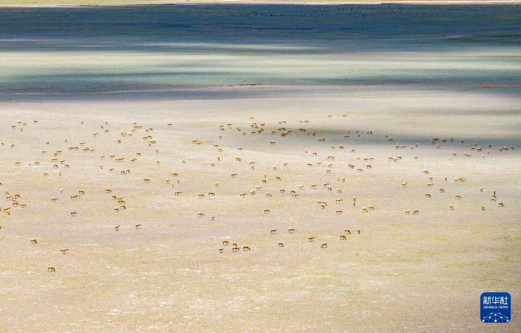 藏羚羊在魯確塘草原集結(jié)(無(wú)人機(jī)照片,6月8日攝)。新華社記者 姜帆 攝??