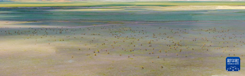 藏羚羊在魯確塘草原集結(jié)(無(wú)人機(jī)照片,6月8日攝)。新華社記者 姜帆 攝