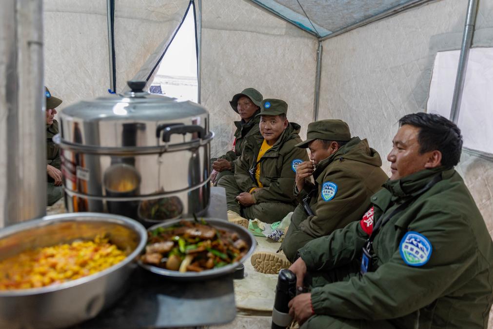 野生動物專業(yè)管護隊員們在巡護途中宿營的帳篷內(nèi)準備吃飯(5月7日攝)。新華社記者 姜帆 攝