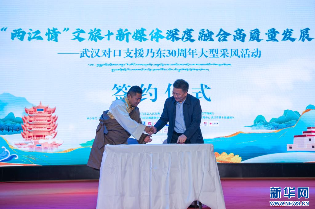 6月20日,啟動儀式現(xiàn)場,武漢廣播電視臺與乃東區(qū)融媒體中心簽署合作協(xié)議。新華網(wǎng) 旦增努布 攝