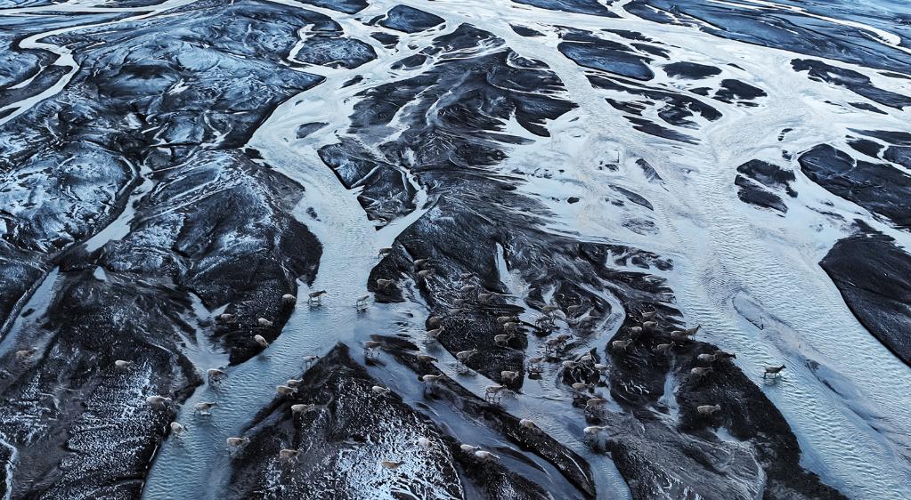 ↑ 在羌塘國家級自然保護區(qū),藏羚羊越過甜水河,前往“產房”。