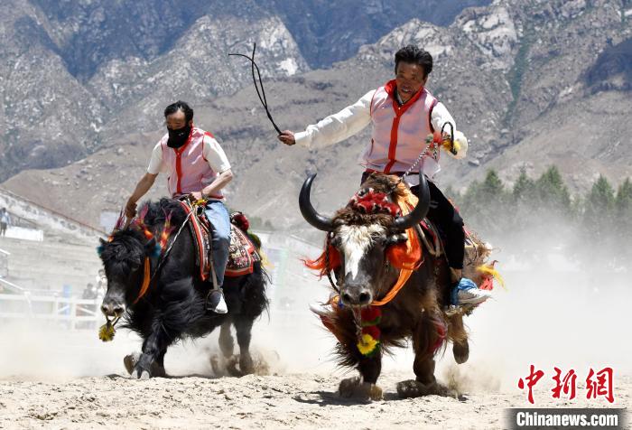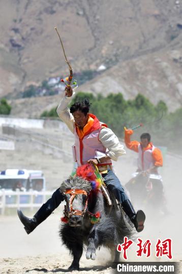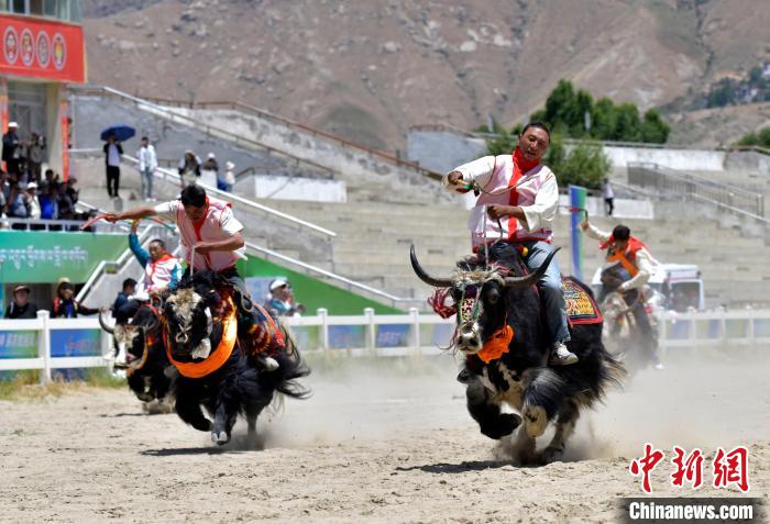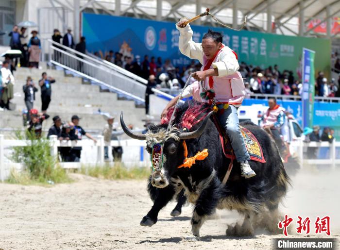 牦牛被譽為“高原之舟”,賽牦牛是藏族的傳統(tǒng)體育項目。6月23日,拉薩首屆農(nóng)牧民運動會上的賽牦牛比賽,騎手們驅(qū)牛疾馳。圖為賽牦牛決賽比賽現(xiàn)場。中新社記者 李林 攝