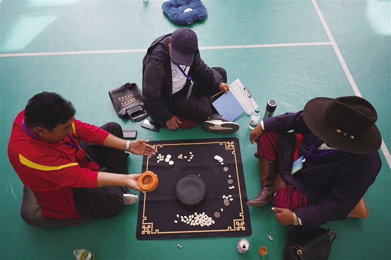當(dāng)日,“吉韌”“秀茲”等項(xiàng)目一同開賽。 “吉韌”也叫藏式克郎球,是藏族的一種彈指運(yùn)動(dòng)。比賽在一張邊長約1米的正方形木桌球臺(tái)上進(jìn)行,球臺(tái)四角有4個(gè)小洞,黑、白兩種扁圓形球子各9個(gè),另有1個(gè)紅色球子放置在球臺(tái)中心,1個(gè)白色母球供雙方彈擊球子所用。
