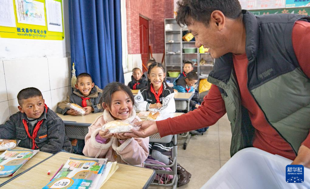 班戈縣中石化小學(xué)后勤副校長尼旦為學(xué)生們分發(fā)營養(yǎng)餐(6月22日攝)。新華社記者 丁增尼達(dá) 攝