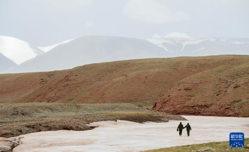 6月15日,羌塘國家級(jí)自然保護(hù)區(qū)野生動(dòng)物專業(yè)管護(hù)隊(duì)員索朗(右)和羅布檢查河面冰凍情況。新華社記者 費(fèi)茂華 攝