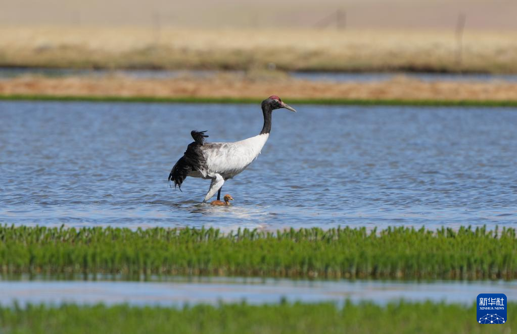 這是在那曲市申扎縣拍攝的養(yǎng)育雛鳥(niǎo)的黑頸鶴(6月9日攝)。新華社記者 姜帆 攝