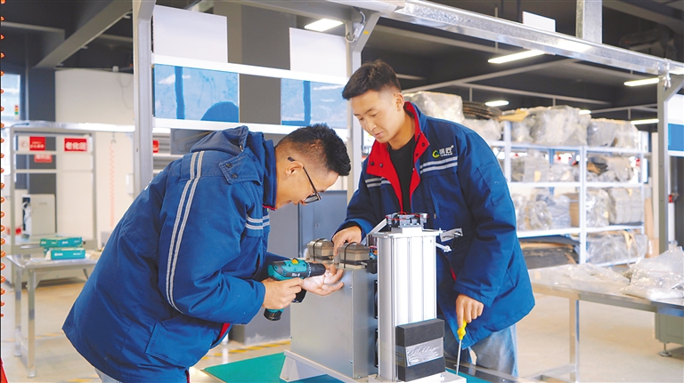 在西藏清匠電器科技有限公司生產(chǎn)車間,來自多頗章鄉(xiāng)嘎東團結新村六組村民朗嘎崔成正和與他一同入職的員工學習安裝制氧機。2023年大學畢業(yè)以來,朗嘎崔成一直待業(yè),偶爾打零工補貼家用,今年3月,嘎東團結新村就業(yè)服務站為他爭取了這個就業(yè)崗位。