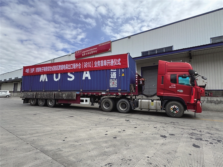 陽光透過云層,灑在堆龍德慶區(qū)城投物流園區(qū)寬廣的場(chǎng)地上,兩輛載有藍(lán)色集裝箱的卡車停靠在物流倉(cāng)前,十分引人注目。這是中國(guó)(拉薩)跨境電子商務(wù)綜合試驗(yàn)區(qū)跨境電商出口海外倉(cāng)“9810”業(yè)務(wù)首單,它們將跨越喜馬拉雅山,將滿載的服裝百貨、家用電器等商品送往尼泊爾加德滿都市的海外倉(cāng)。