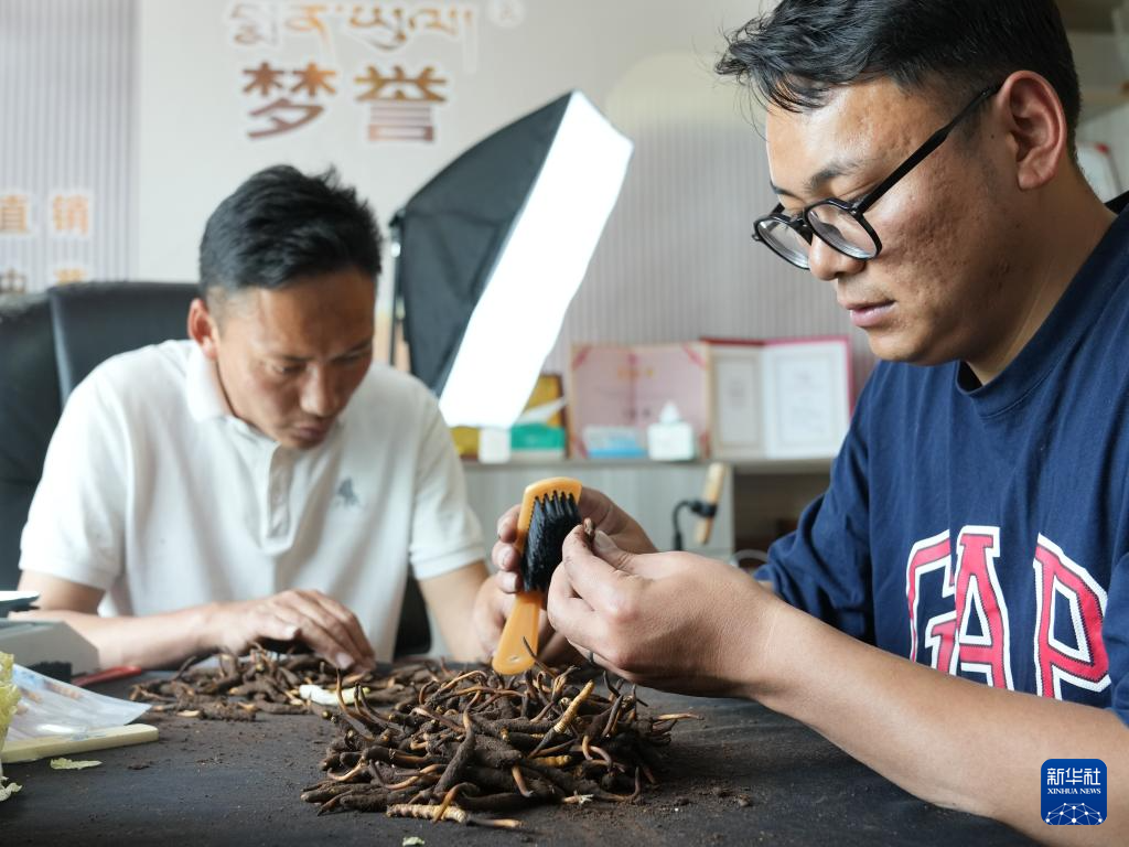 5月31日,在西藏拉薩市,藏族青年羅拉(右)在公司內(nèi)清潔新鮮蟲(chóng)草。新華社記者 丁汀 攝