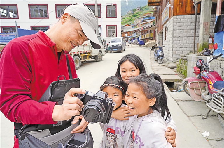 圖為日喀則市文聯(lián)采風(fēng)團(tuán)成員在陳塘鎮(zhèn)向小朋友展示采風(fēng)照片。