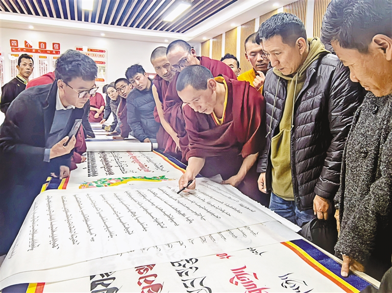 圖為日喀則市文聯(lián)組織書法協(xié)會(huì)開展藏文書法交流活動(dòng)。