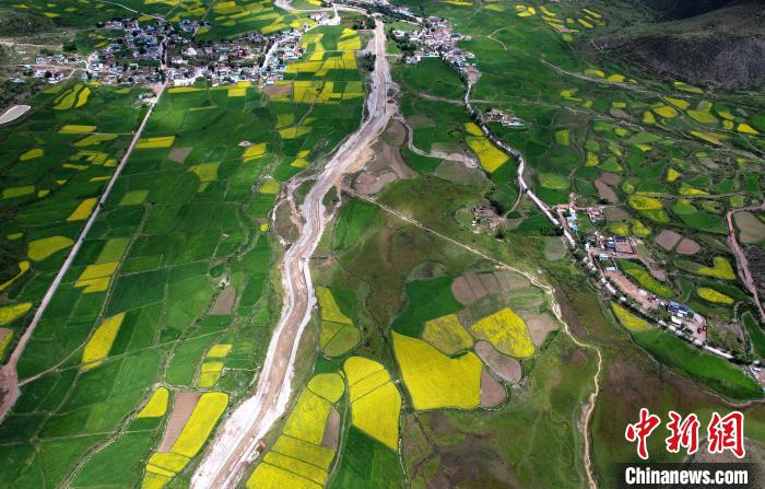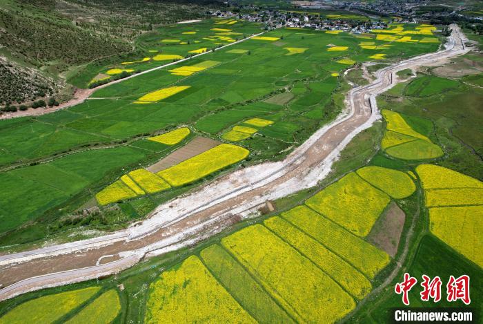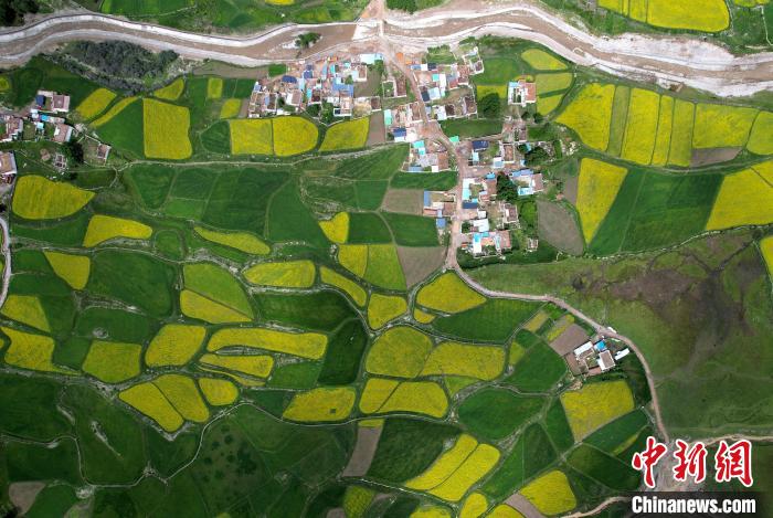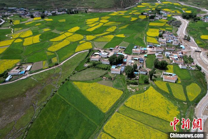 盛夏,西藏墨竹工卡油菜花盛放,一片金黃,風(fēng)光宜人。油菜花與綠油油的青稞地以及藏式民居,共同繪就鄉(xiāng)村美麗畫卷。圖為7月10日,拉薩市墨竹工卡縣油菜花盛放。(無人機照片)中新社記者 李林 攝