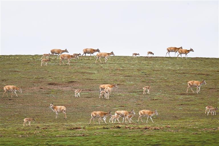 圖為7月8日,在可可西里卓乃湖區(qū)域,一群藏羚羊在活動。新華社記者 張龍 攝