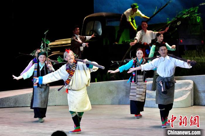 7月13日晚,由西藏自治區(qū)藏劇團(tuán)打造的新編現(xiàn)實(shí)題材藏戲《綠色哈達(dá)》在拉薩開演。該劇將傳統(tǒng)藏戲元素與現(xiàn)代舞臺表現(xiàn)手法相結(jié)合,展現(xiàn)了西藏通過實(shí)施“一江兩河”等工程形成的高原生態(tài)治理成效。圖為演出現(xiàn)場。中新社記者 李林 攝