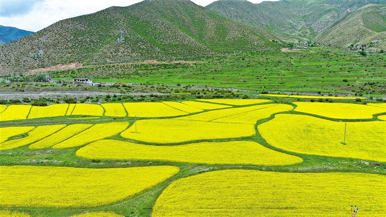 最近,墨竹工卡縣迎來了油菜花的盛開時節(jié)。放眼望去,滿目的油菜花如同金黃色的毯子般鋪展開來,在微風中搖曳,散發(fā)出迷人的香氣。一團團、一簇簇的金黃色花朵點綴在田野上,流動著濃濃夏意。成片的花海與蜿蜒的農(nóng)村公路、錯落有致的村居共同構成了一幅和諧美麗的田園風景圖。