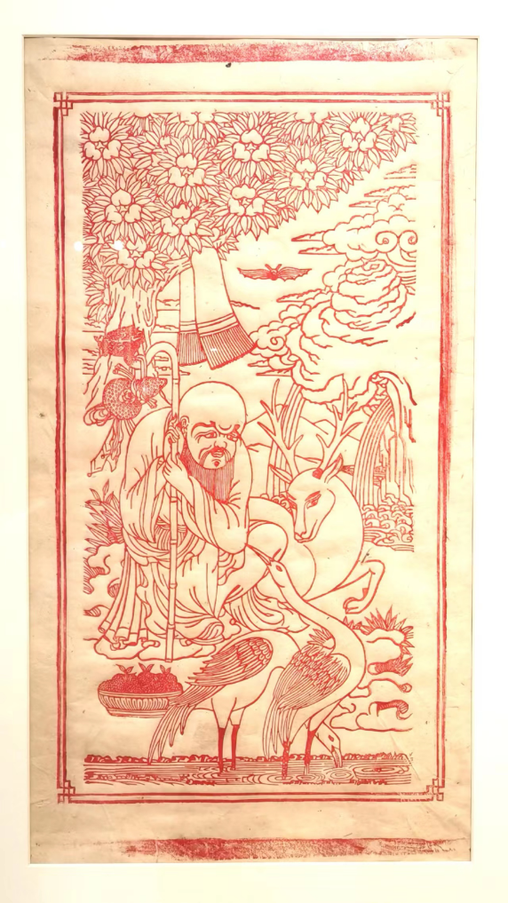 雕版拓片《六長壽》,印有長壽巖、長壽老人、長壽水、長壽樹、長壽鶴、長壽鹿六樣元素,是西藏經(jīng)典的風俗畫題材,其中長壽老人還有內(nèi)地壽星形象的標志性凸額。由于寓意吉祥,它出現(xiàn)在唐卡、家用藏式柜彩畫以及布達拉宮的壁畫上。