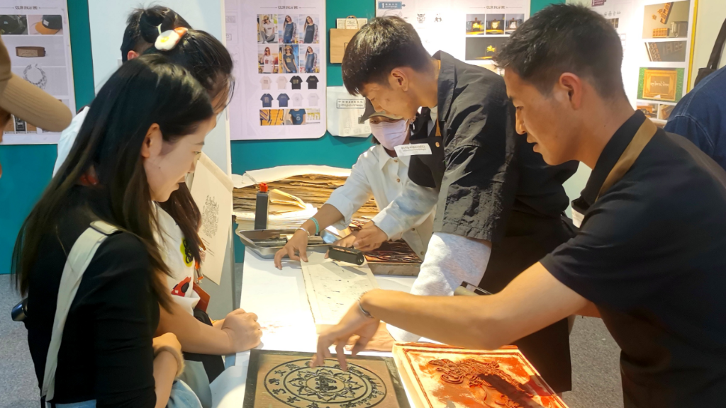 在文創(chuàng)區(qū),雕版被玩得“腦洞大開”。一組搶眼的提燈,燈面是矢量處理的拓片圖案,它帶手柄的木框正是西藏雕版的傳統(tǒng)形狀。手機殼、鑰匙扣、文化衫和帆布包也印刻上雕版圖案,連同親手完成的拓片一起,成為“帶得走”的“文物”。