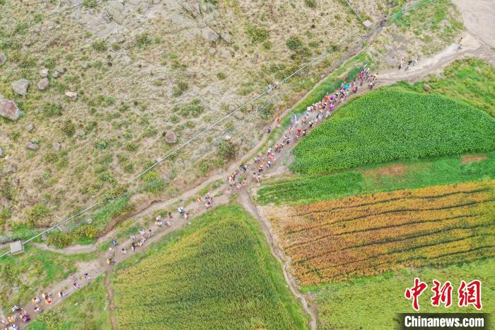 7月24日,西藏拉薩市曲水縣南木村迎來(lái)了一年一度的“望果節(jié)”。當(dāng)日,村民們盛裝打扮背上經(jīng)文,圍繞全村田園轉(zhuǎn)上一圈,轉(zhuǎn)到每一塊農(nóng)田前都要煨桑祈求風(fēng)調(diào)雨順、五谷豐登。“望果節(jié)”民俗已有1500多年的歷史,是國(guó)家級(jí)非物質(zhì)文化遺產(chǎn)。圖為曲水縣南木村村民身著盛裝背上經(jīng)文繞田。(無(wú)人機(jī)照片)中新社記者 貢嘎來(lái)松 攝