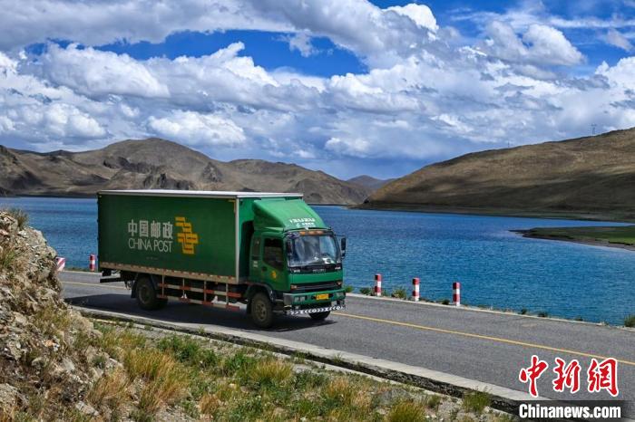 6月21日,一輛郵件運(yùn)輸車輛行駛在高原湖畔。(西藏自治區(qū)郵政管理局 供圖)