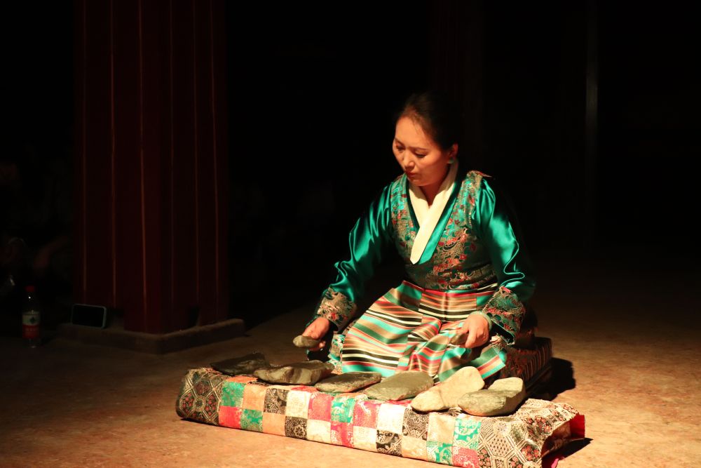 石琴使用天然的石塊作為伴奏樂器,從遠古開始就在高原上被人演繹。演奏者手持兩塊小石頭,跪坐在幾塊類似琴鍵的大石頭前,大小石頭在不同位置碰撞出不同的音高,演奏者按一定音階順序?qū)⑹^排列在琴架上,演奏出悅耳的旋律。