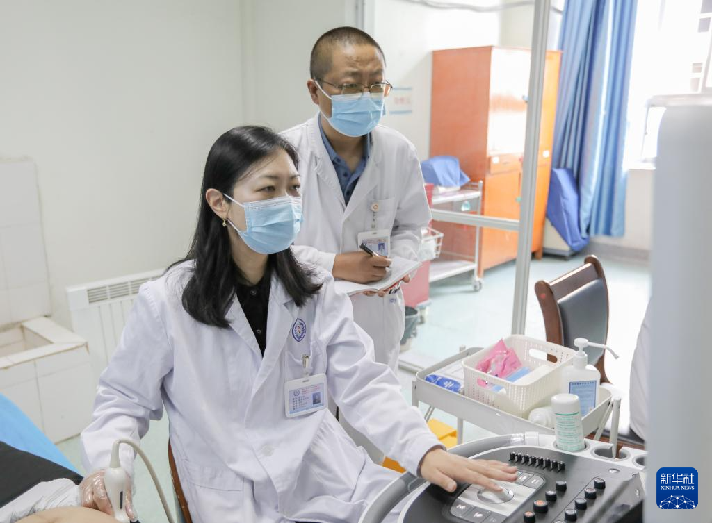 在西藏自治區(qū)人民醫(yī)院,徐鐘慧(左)與徒弟宋彬彬在為患者進行超聲檢查(7月12日攝)。新華社記者 丁汀 攝