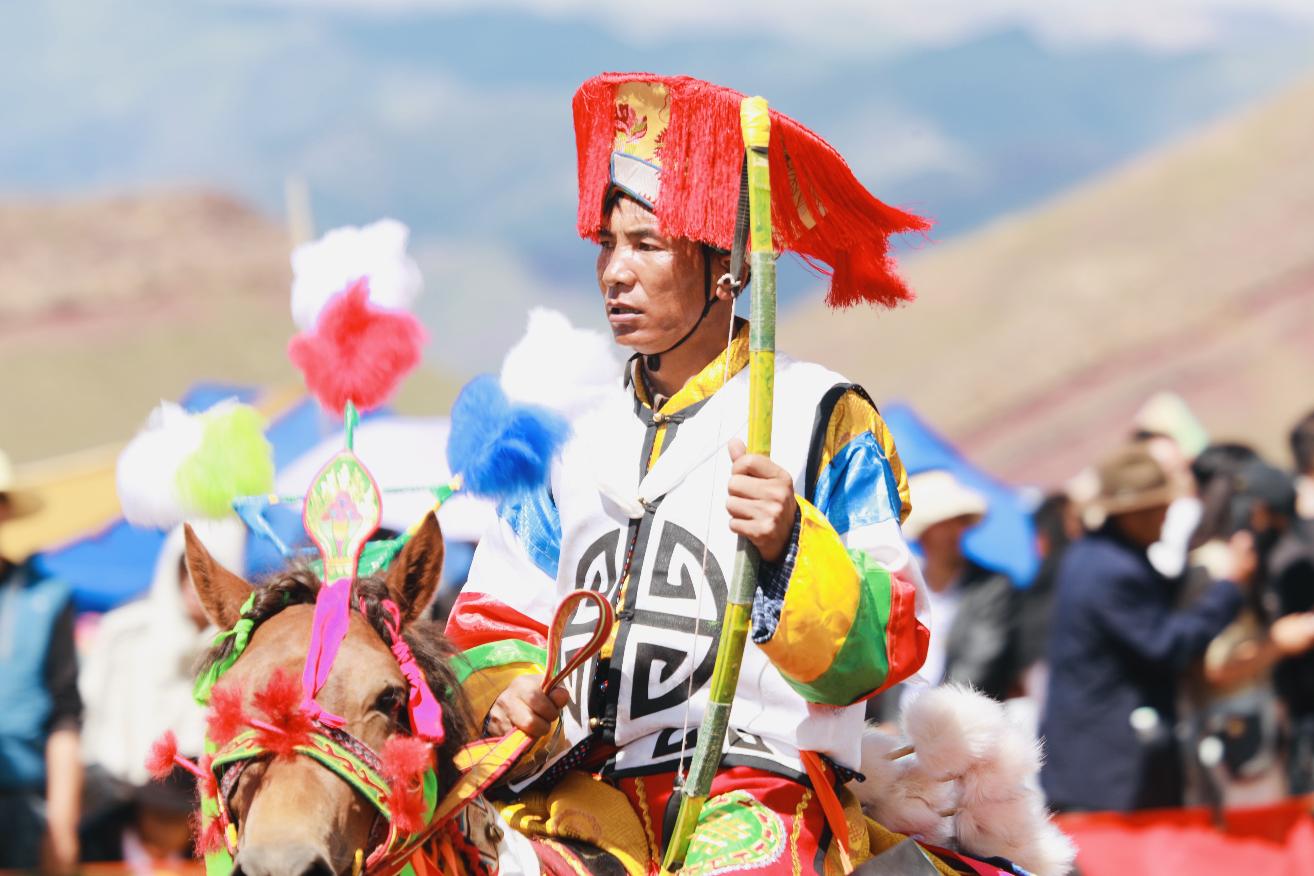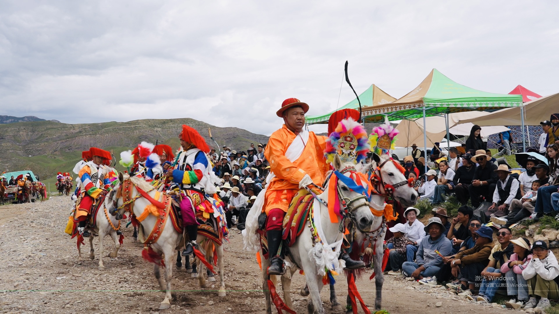 在林周縣邊交林鄉(xiāng)當杰村“望果節(jié)”活動現(xiàn)場,隨著激昂的《運動員進行曲》,當杰村“平措林望果節(jié)”活動拉開帷幕,38名馬術(shù)運動員、38名射箭運動員在2萬多名觀眾的歡呼聲中邁入現(xiàn)場。圖為賽馬選手參加射箭比賽。