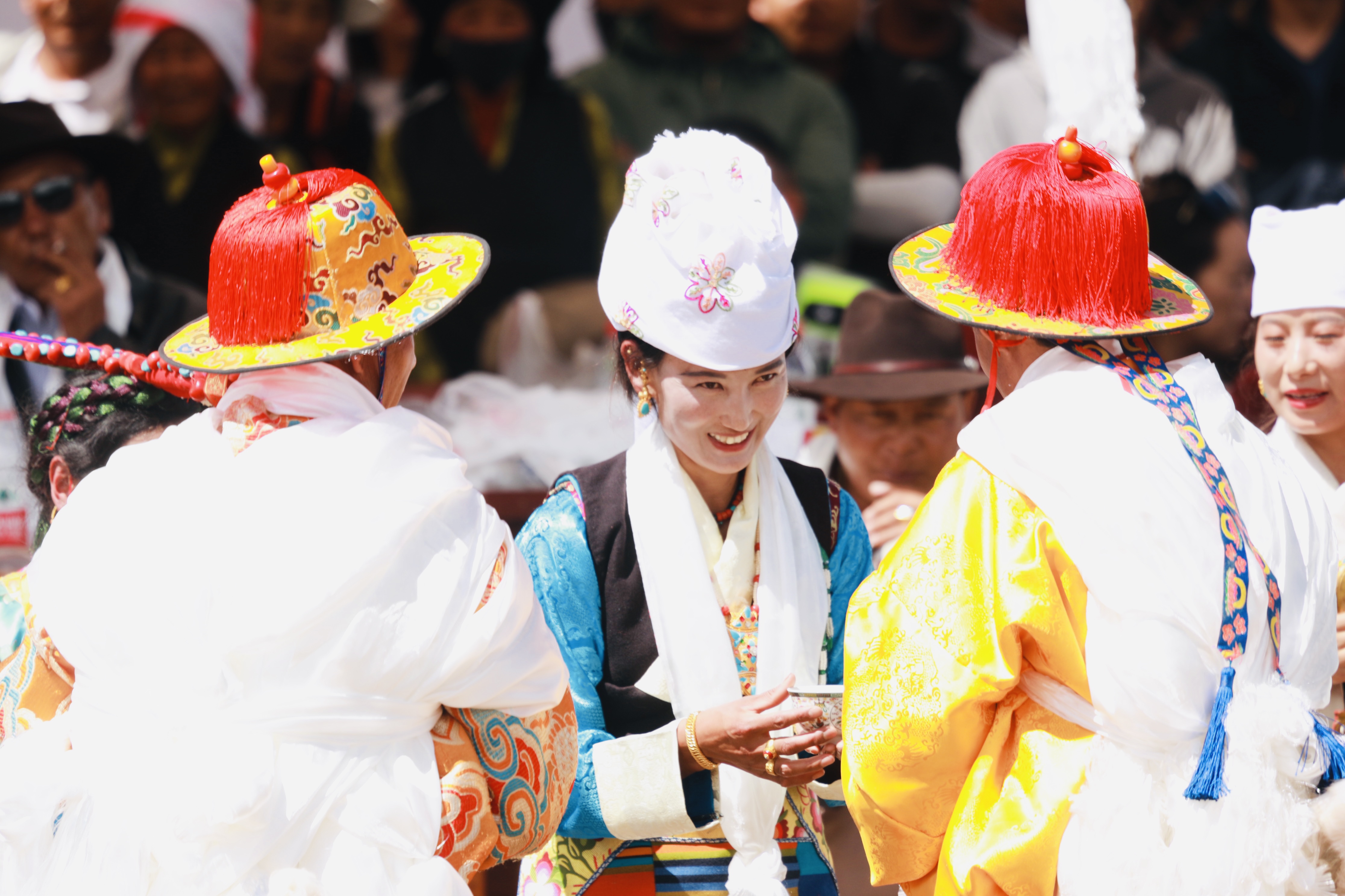據(jù)悉,賽馬是西藏各地為慶祝豐收舉行“望果節(jié)”(賽馬節(jié))時的傳統(tǒng)慶典活動,是群眾最為喜愛、流傳最廣的體育運動之一。圖為沖許嘛(藏語意為“敬酒者”)為騎手唱歌、敬酒、敬茶。