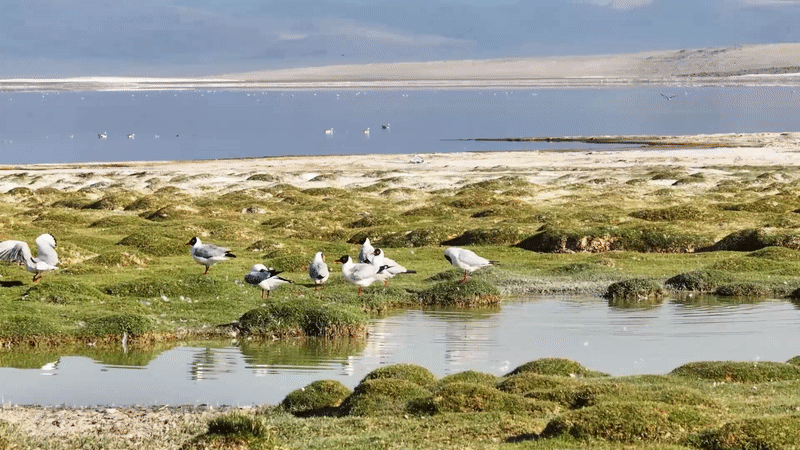 在扎日南木錯(cuò)湖西北處的淡水淺灘區(qū)生長著茂密的水草和藻類,形成適合鳥類棲息的生態(tài)濕地。